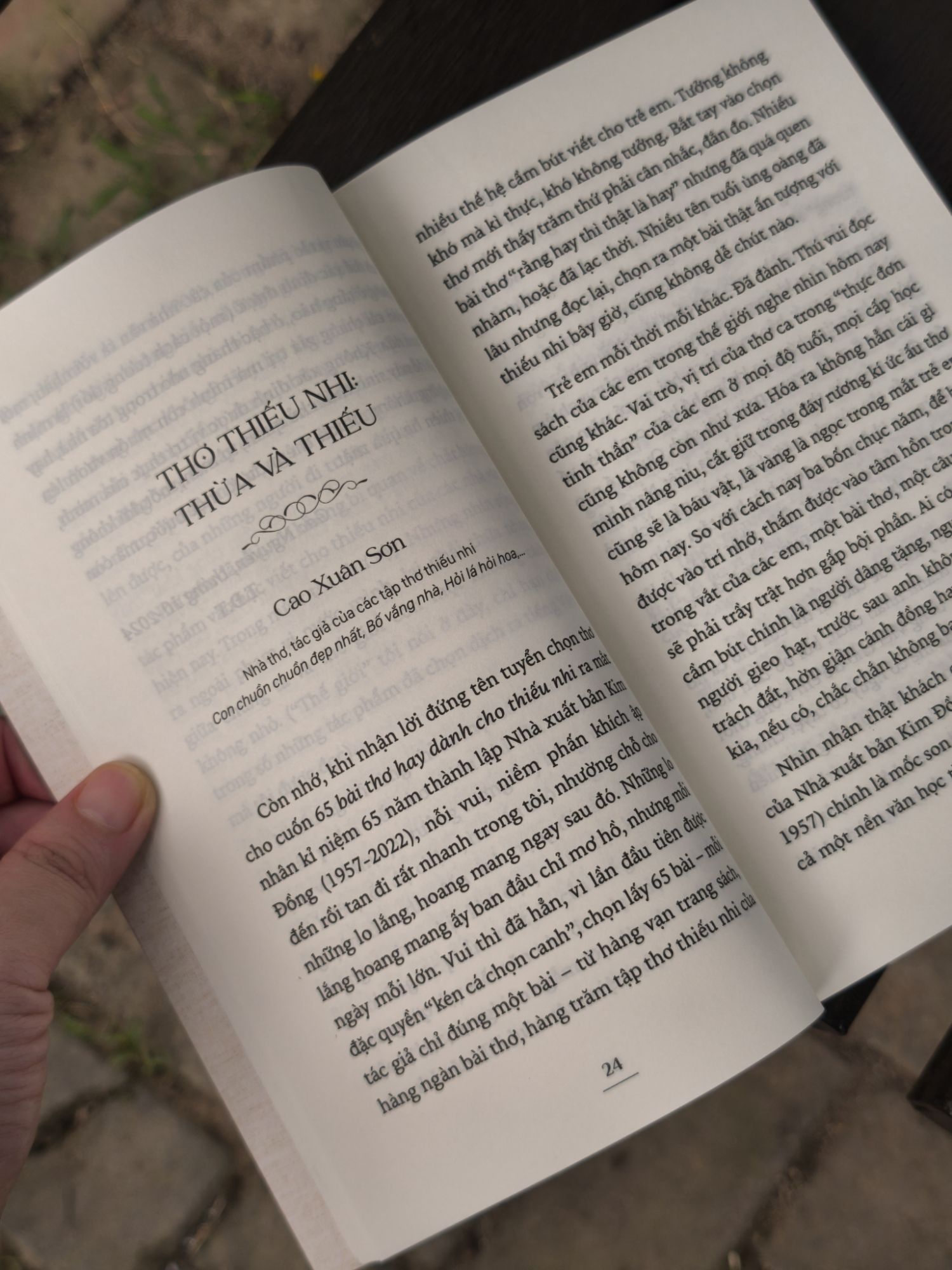 Với tâm thế từ ngoài nhìn vào, trường quy hơn, bao quát hơn, lí tính hơn, từ thực tiễn nghiên cứu, giảng dạy văn học thiếu nhi, là tiểu luận của các nhà nghiên cứu phê bình Lã Thị Bắc Lý, Lê Nhật Ký, Bùi Thanh Truyền, Trịnh Đặng Nguyên Hương, Thanh Tâm Nguyễn, Nguyễn Thị Thanh Hương, Thuỵ Anh,… về sự chuyển động của các đề tài, thể loại và hiện tượng trong văn học thiếu nhi.
