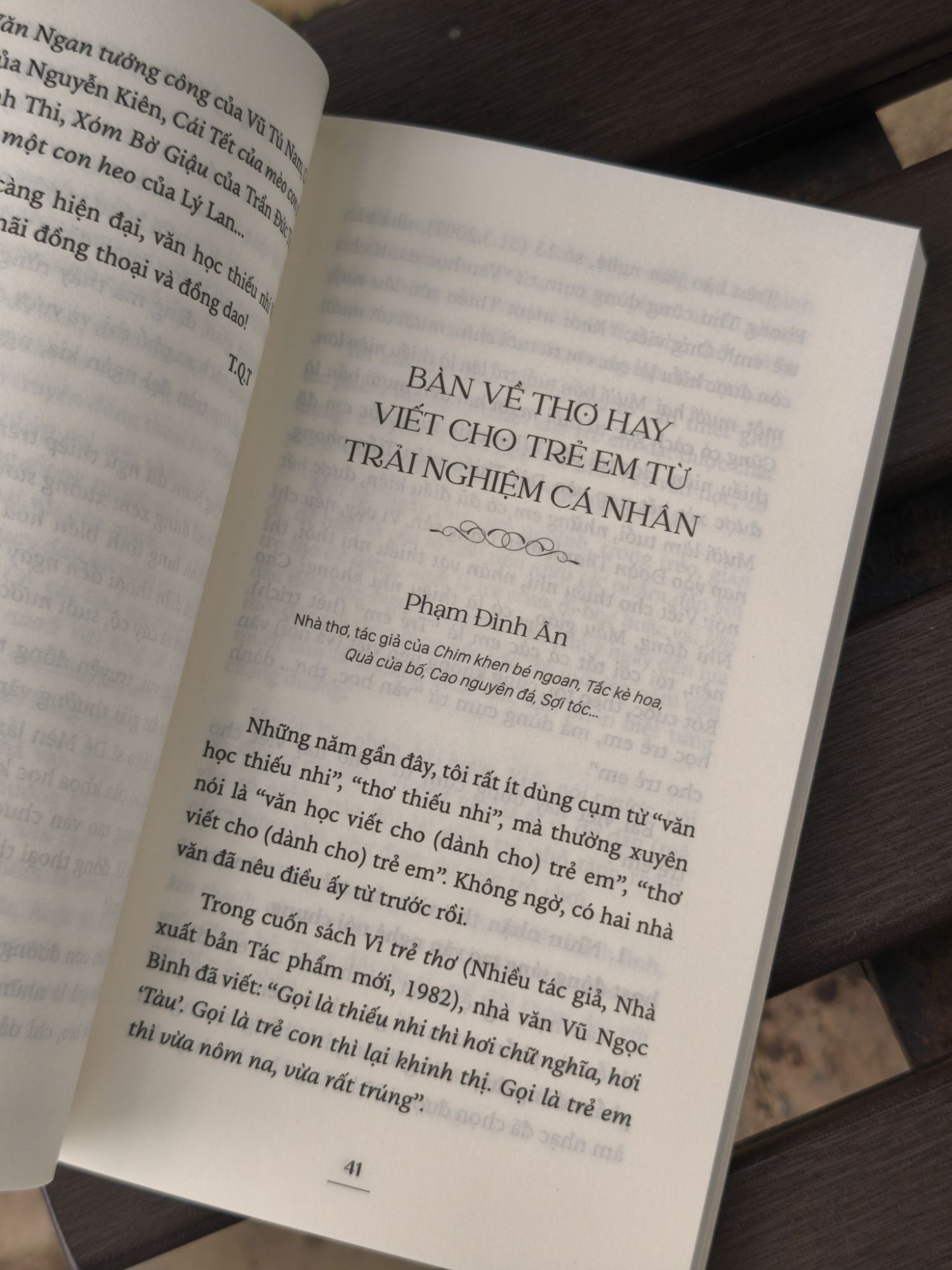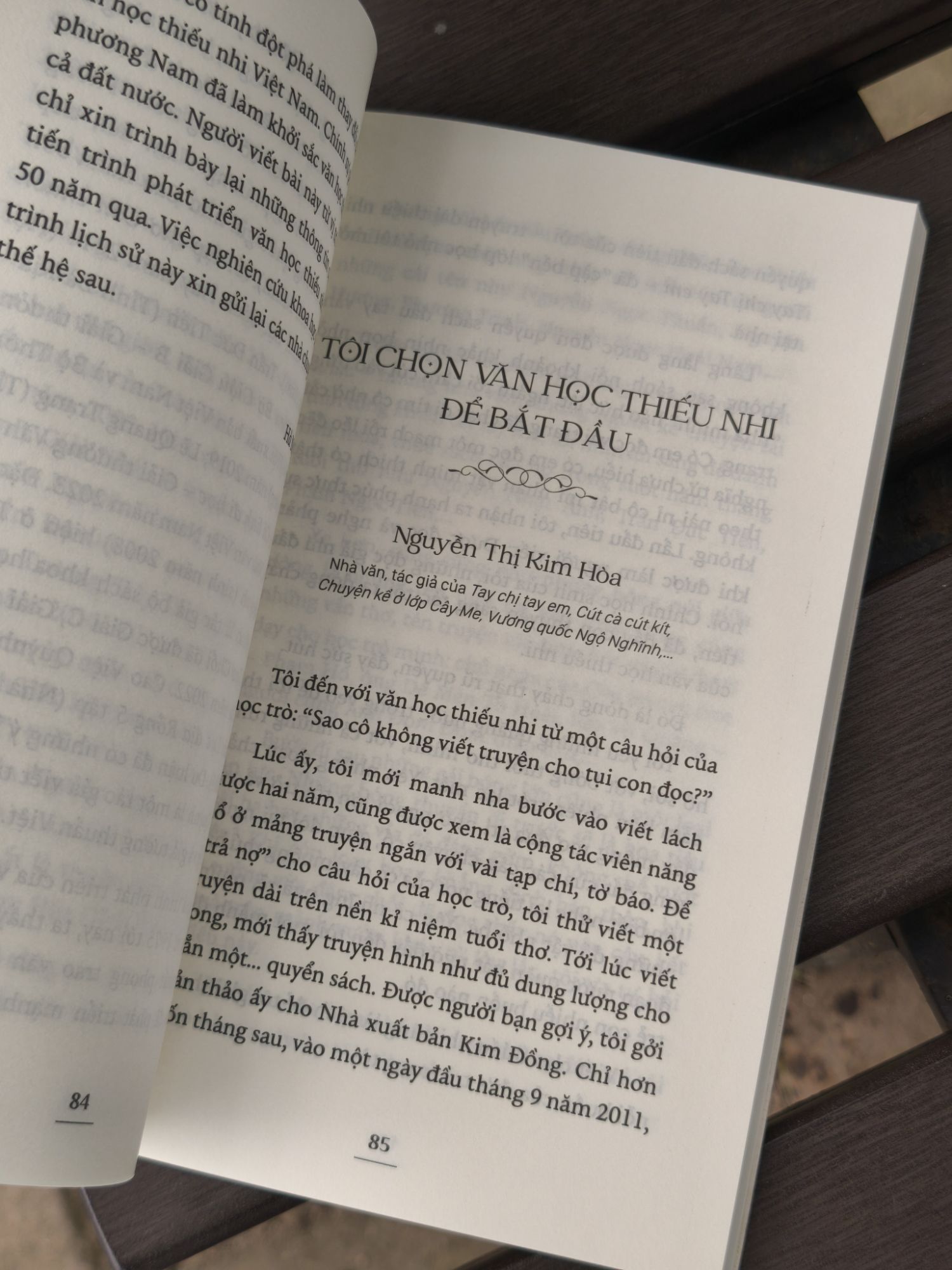 Với tâm thế từ trong nhìn ra, là các bài viết của các nhà văn, nhà thơ Nguyễn Nhật Ánh, Trần Đức Tiến, Trần Quốc Toàn, Phạm Đình Ân, Quế Hương, Lê Phương Liên, Cao Xuân Sơn, và trẻ hơn là Bùi Tiểu Quyên, Nguyễn Thị Kim Hoà. Mỗi người một góc nhìn, từ quan sát và trải nghiệm viết của cá nhân, sẽ mang đến những khơi gợi riêng khác, nhiều xúc cảm và cũng thật gần gũi về văn học thiếu nhi.